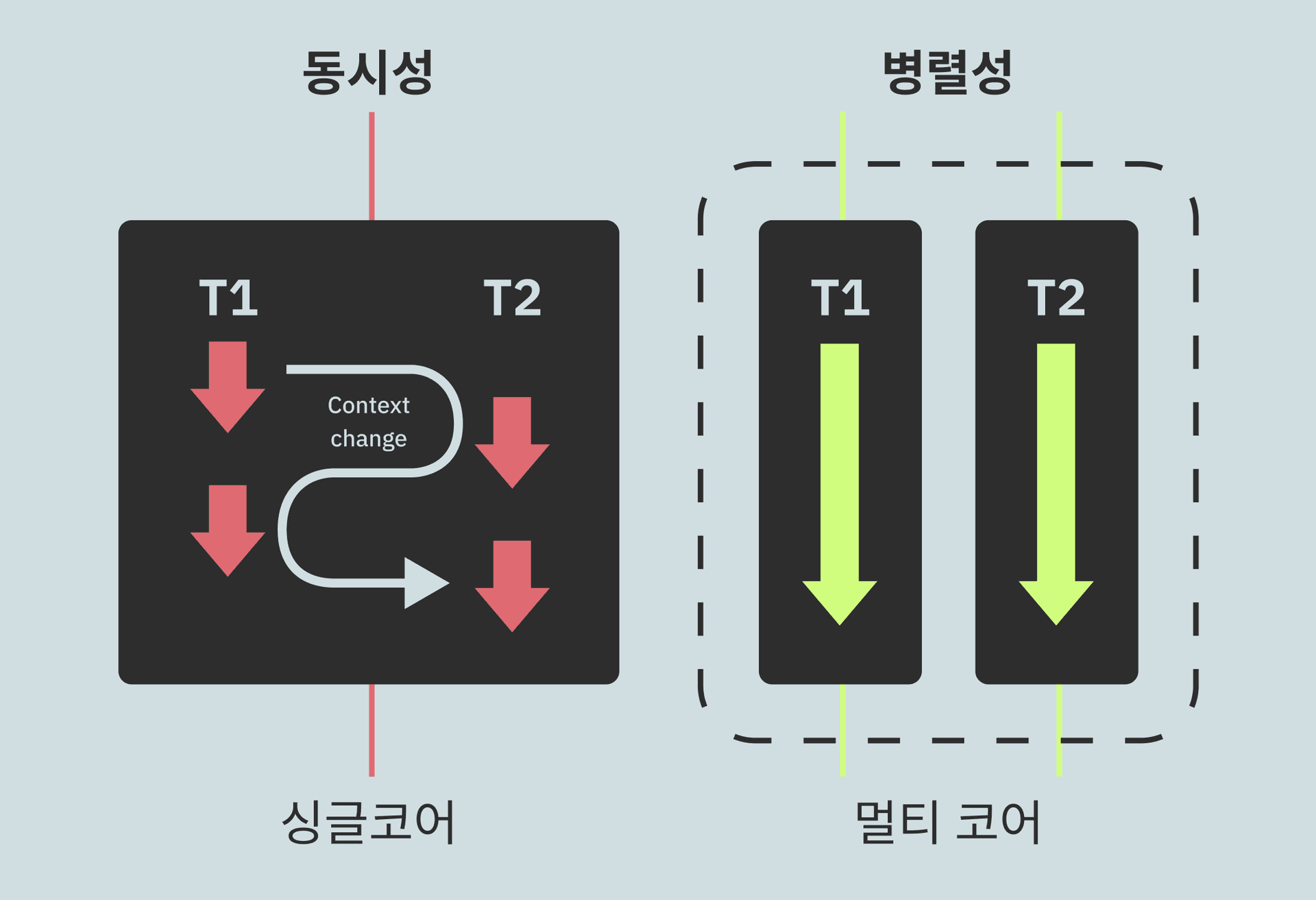 병렬성은 멀티 코어 환경에서 실제로 여러 작업이 동시에 처리되는 개념입니다. 반면, 동시성은 싱글 코어에서도 작동할 수 있으며, 여러 작업이 동시에 실행되는 것처럼 보이지만 실제로는 번갈아 가며 실행됩니다. 마치 여러분이 동영상을 보다가 코드를 작성하는 것처럼, 작업 간에 전환하면서 여러 일을 처리하는 방식이에요.