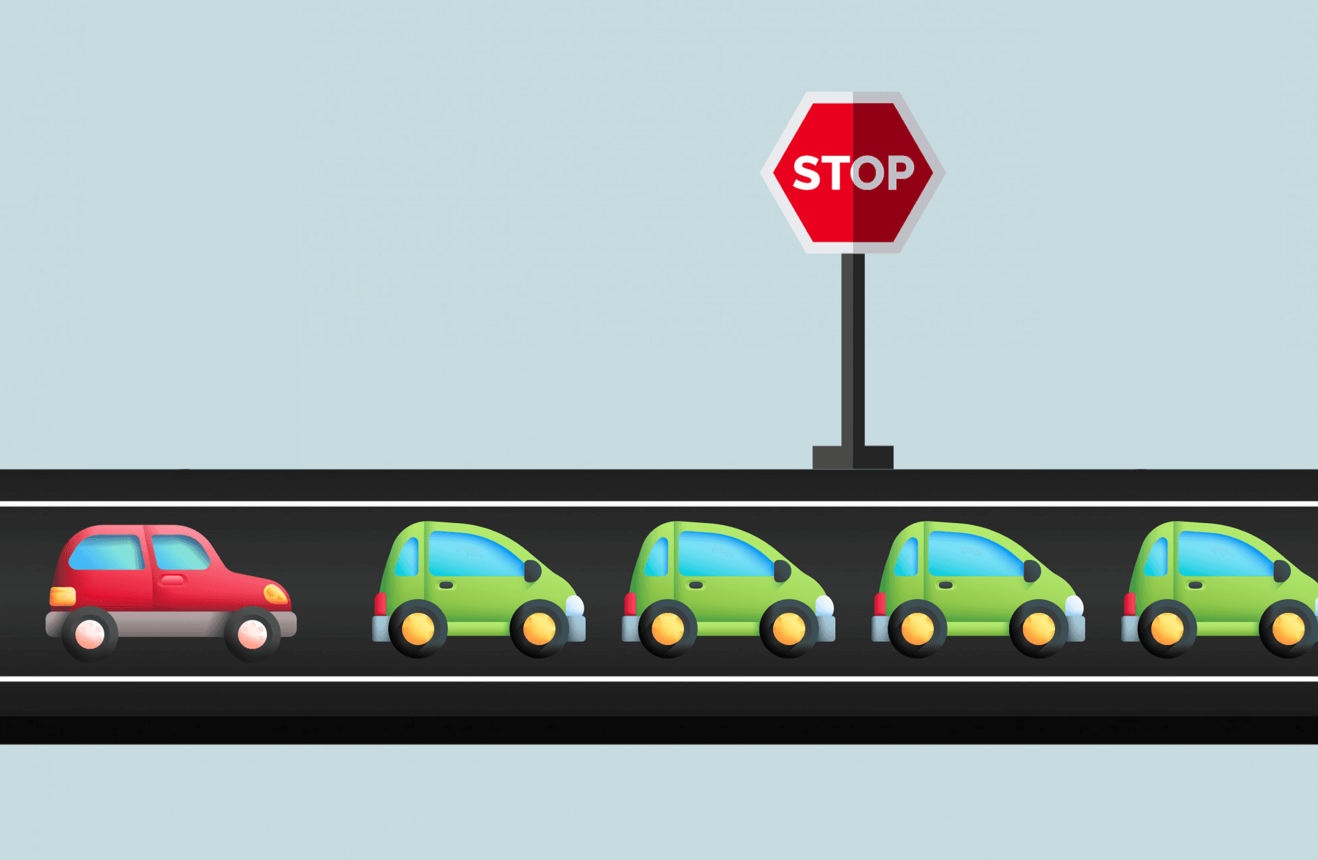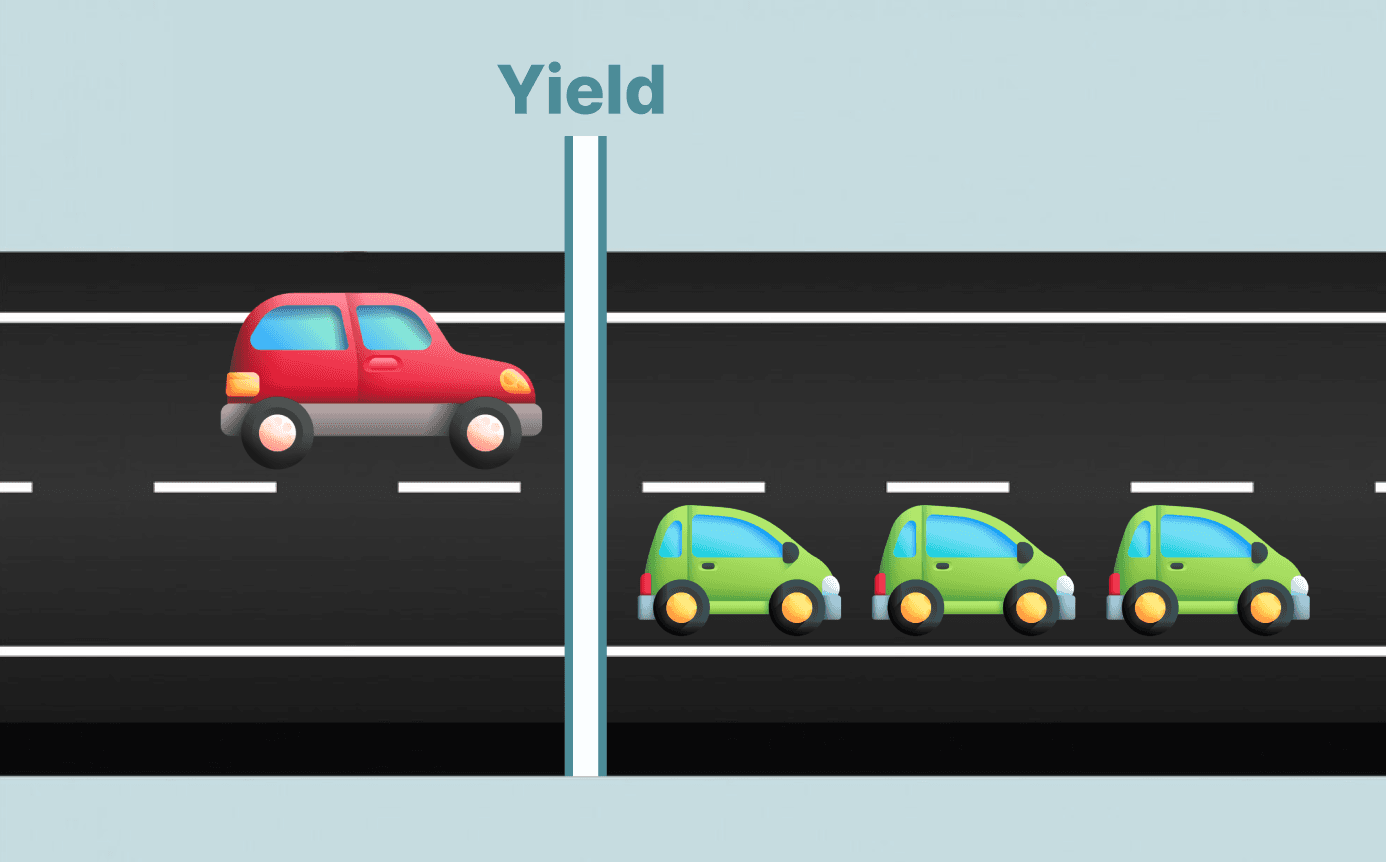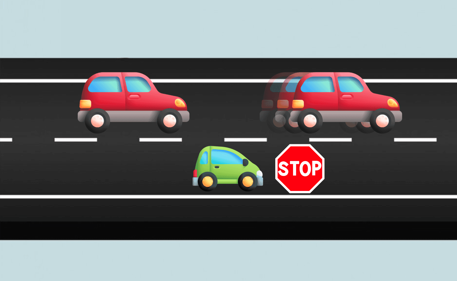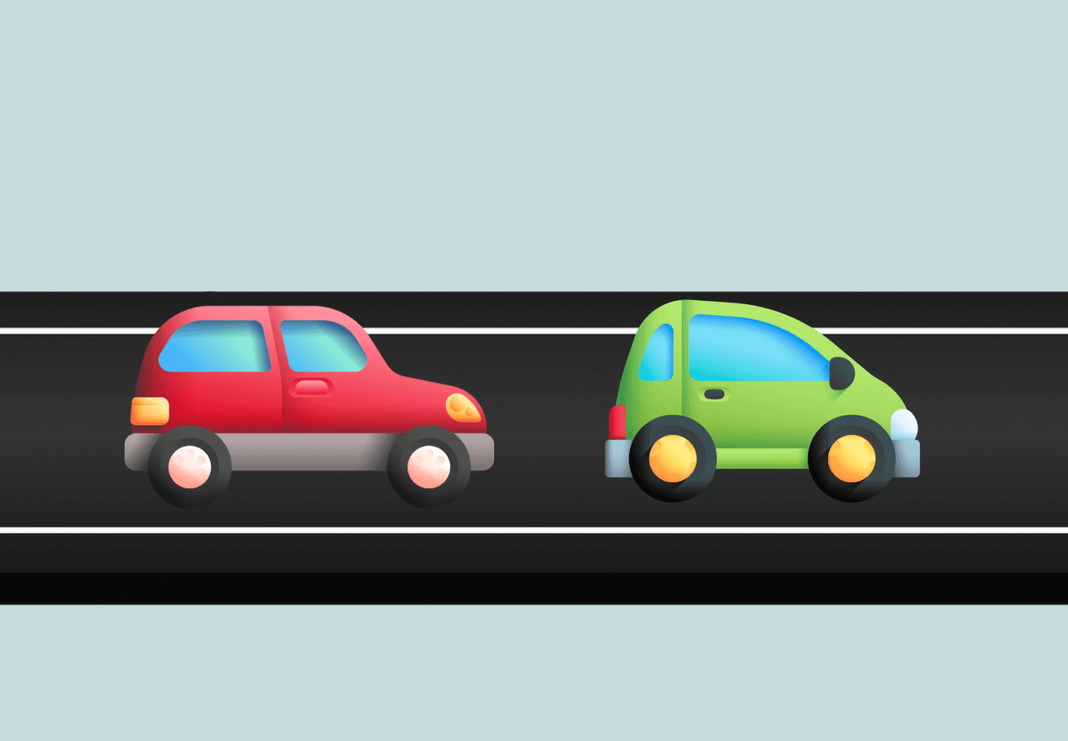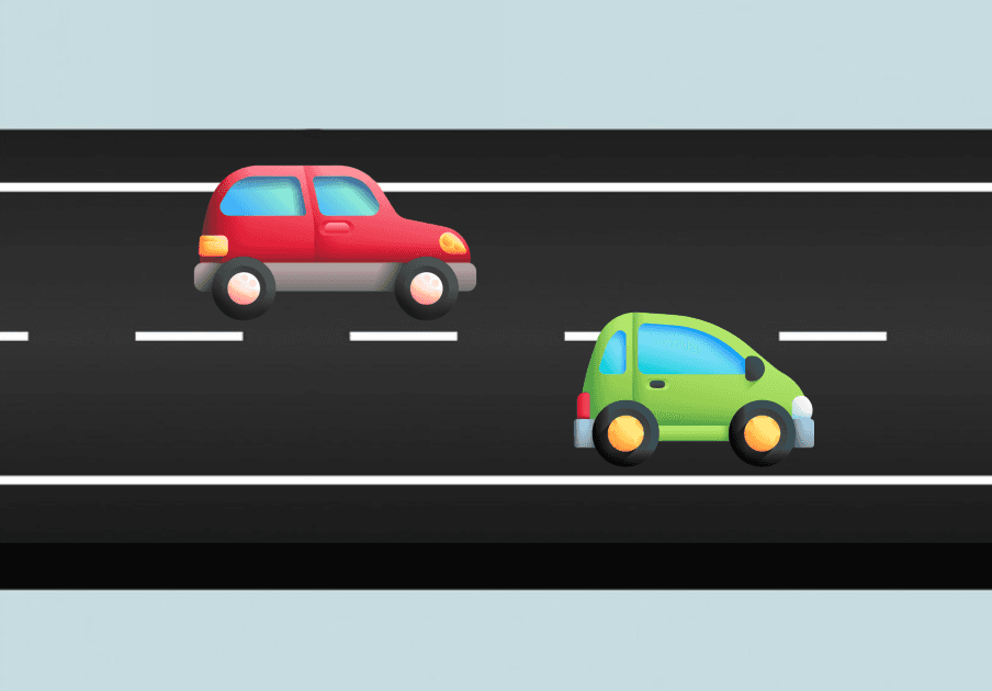 여기 1차선을 달리는 두 차량이 있습니다. 도로가 1차선이므로 빨간 차는 초록 차가 지나가는 속도에 맞춰 함께 달릴 수밖에 없습니다.
