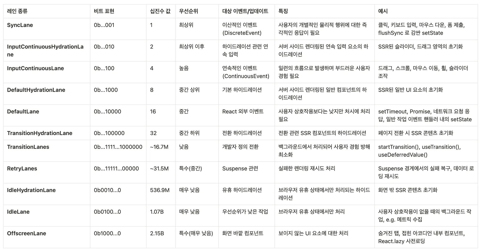 레인 모델 내에는 다양한 종류의 레인이 있으며, 각각은 특정 유형의 업데이트를 처리합니다. 이 시작점은 DOM 이벤트일 수도 있고 비동기, 전환 이벤트일 수도 있으며, 레인은 하나의 이벤트에 대응합니다.